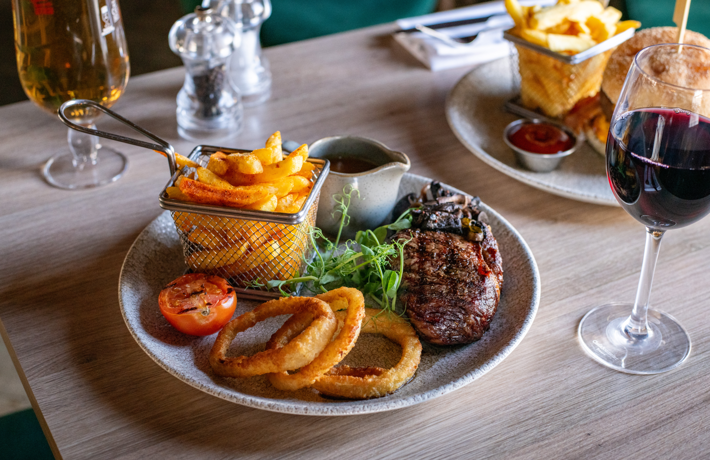 Our signature steaks are a real treat. Pick a Ribeye or tender Sirloin, served alongside seasoned fries, crispy onion rings, forest mushrooms and a grilled plum tomato.